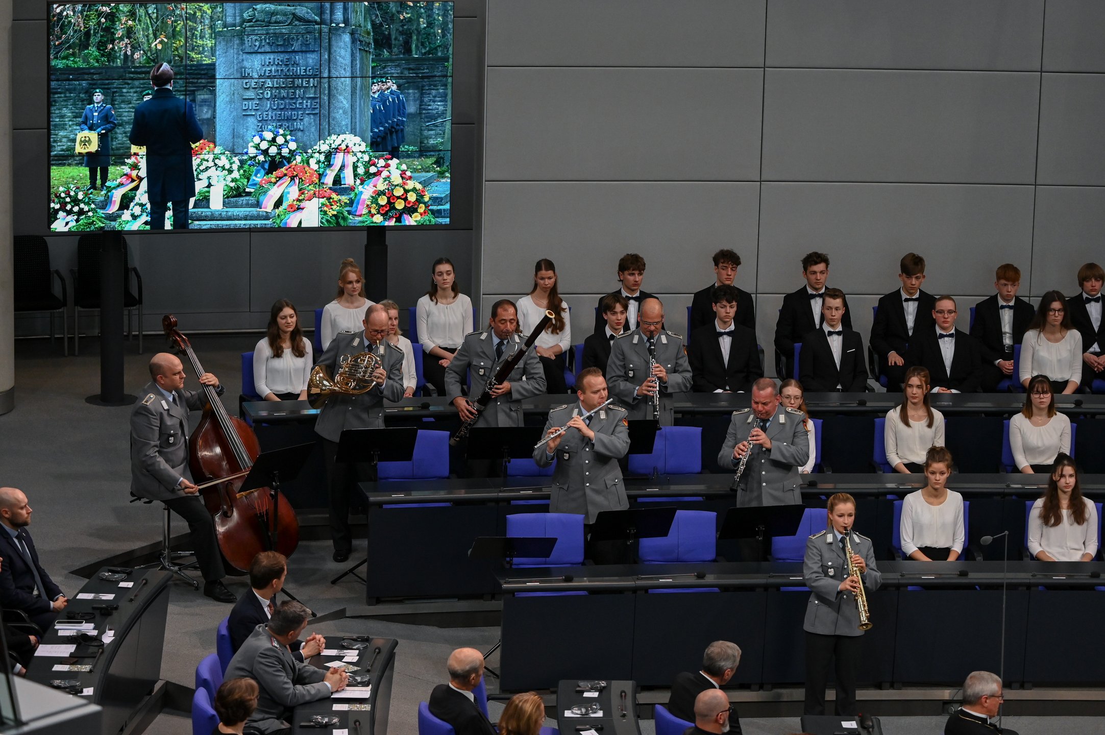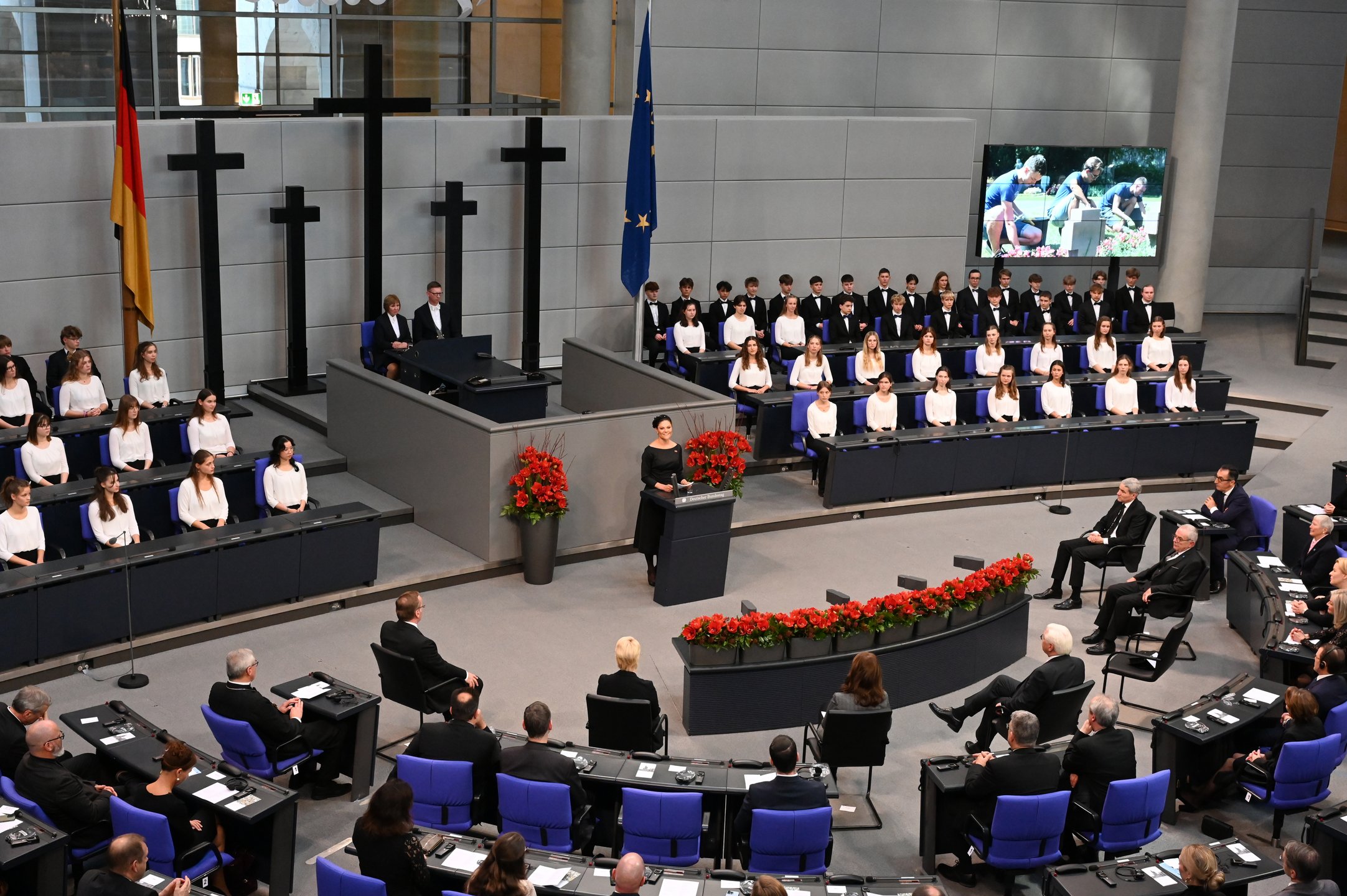 Den Volkstrauertag 2023 begingen wir gemeinsam mit unserem Partnerland Schweden. Zusammen erinnerten wir an unsere weitreichende Geschichte bis hin zur heutigen Partnerschaft in einem vereinten Europa der freiheitlichen und friedlichen Demokratien. Zugleich wurde in diesem Jahr im Besonderen der Toten des Angriffskrieges gegen die Ukraine gedacht. Als Hauptrednerin sprach I.K.H. Kronprinzessin Victoria von Schweden im Deutschen Bundestag. Der Jugendchor des Goethe-Gymnasiums Schwerin sowie das Musikkorps der Bundeswehr umrahmten die Gedenkstunde musikalisch . Zudem waren vier kurze Redebeiträge zum Thema "70 Jahre Jugendarbeit an Kriegsgräberstätten" von Personen aus der Zivilgesellschaft zu hören.