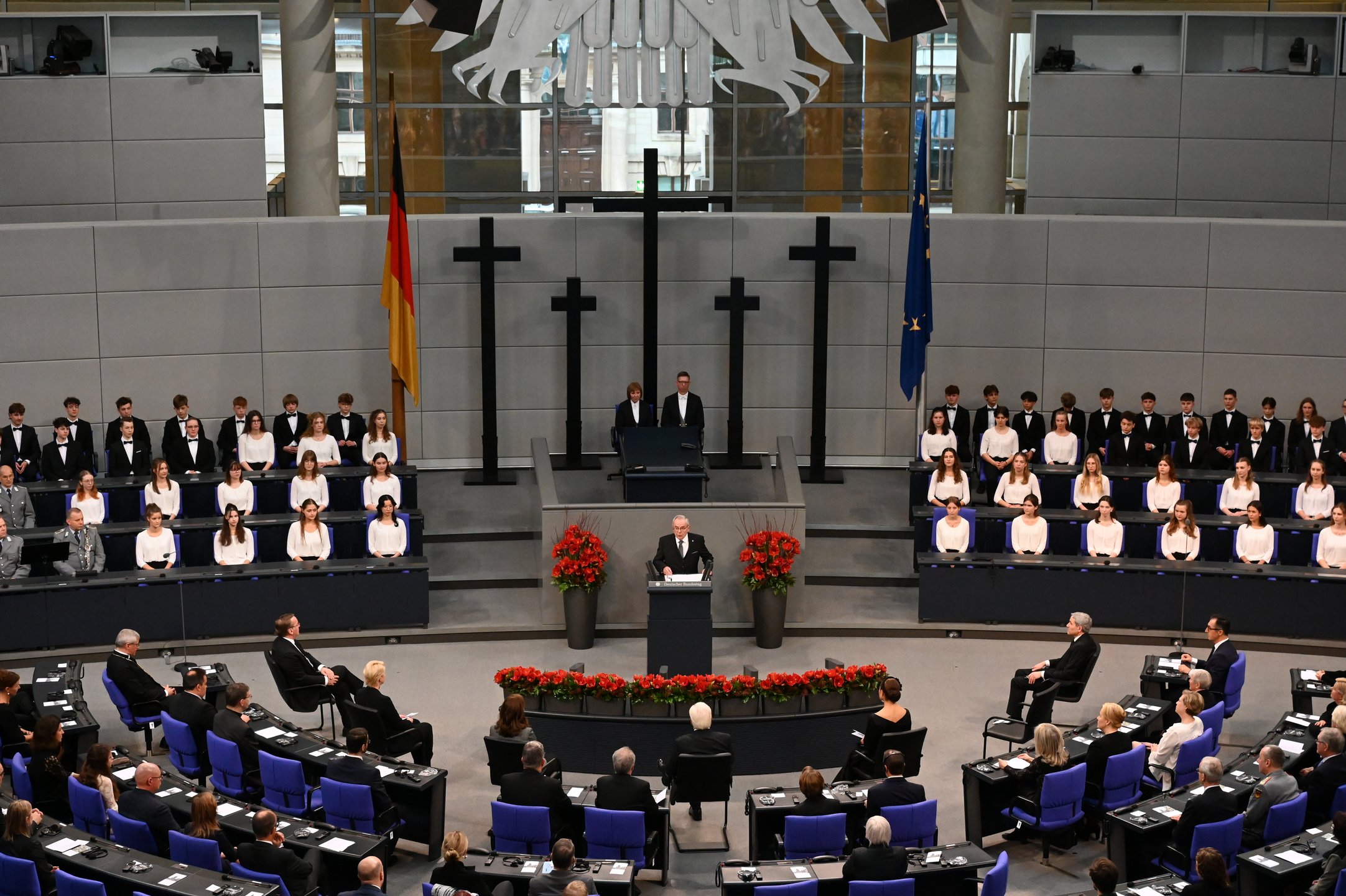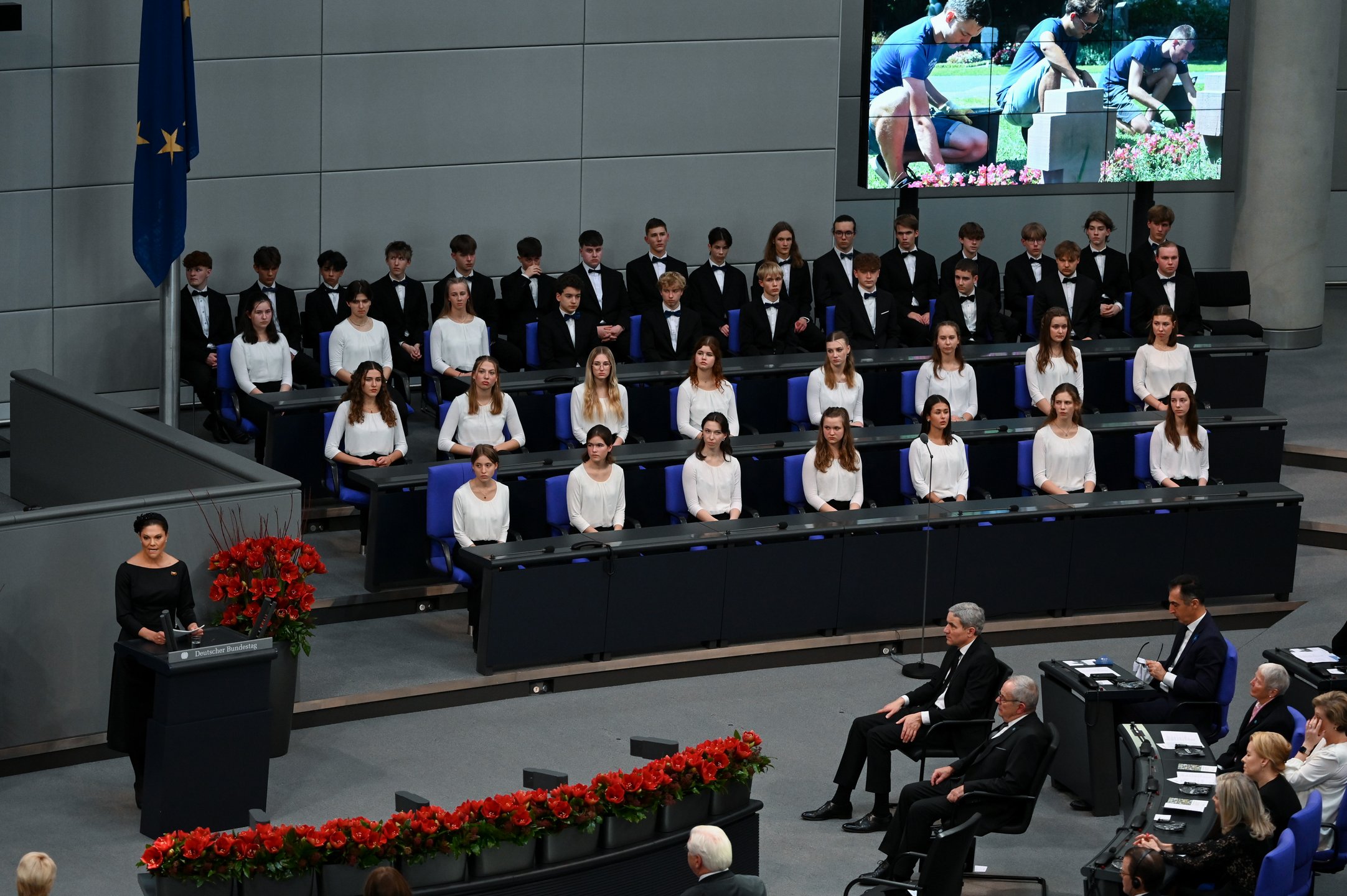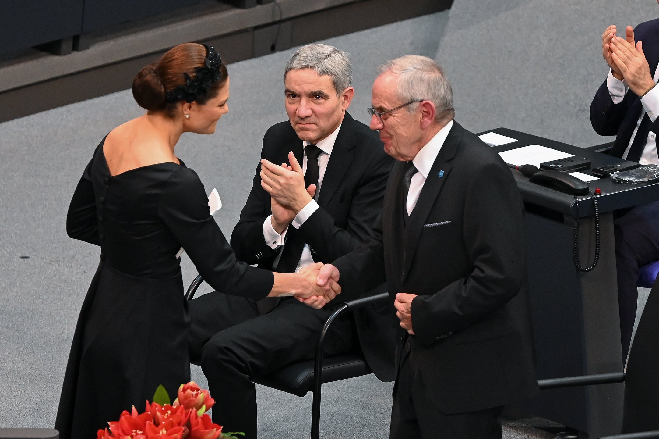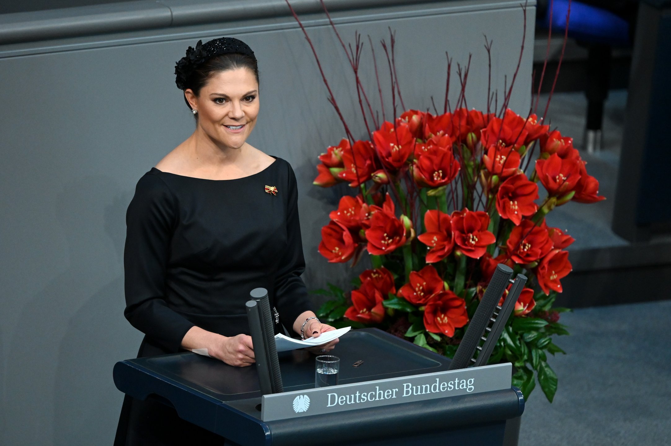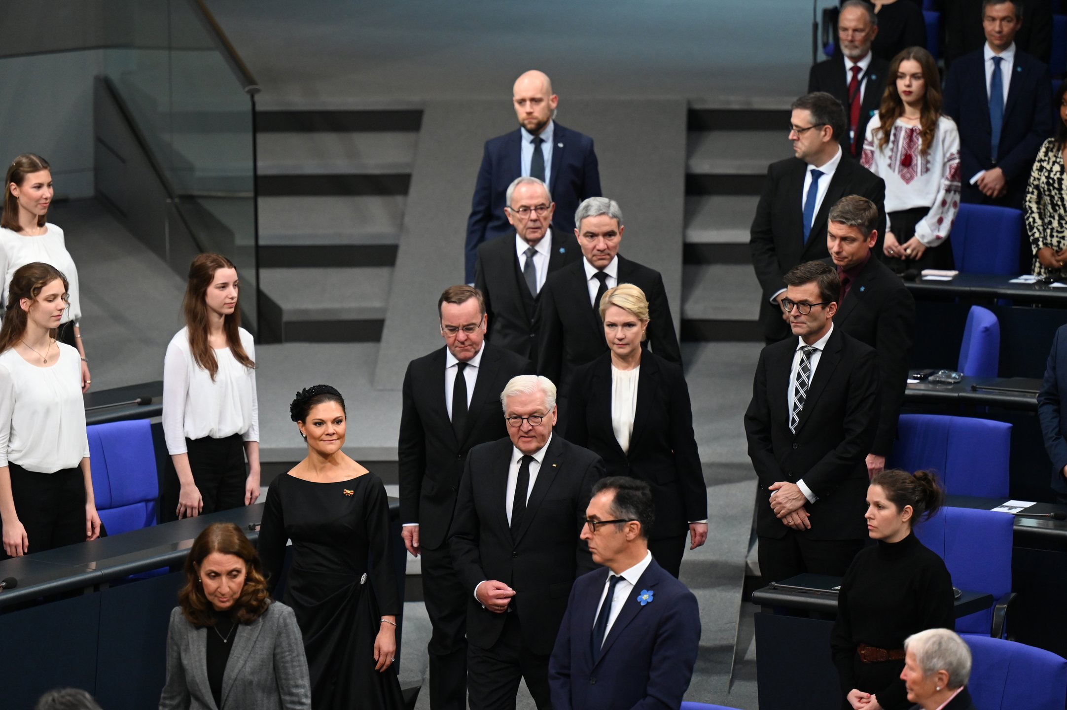 „Wir versammeln uns hier in ernsten Zeiten“, sagte Kronprinzessin Victoria auf Deutsch vor den rund 1.200 Gästen im Rund des Berliner Reichstages. Mit ihrer tiefen Stimme erreichte die Monarchin mühelos ihre Zuhörerinnen und Zuhörer, darunter viele hochrangige Repräsentanten aus Politik und Zivilgesellschaft.
