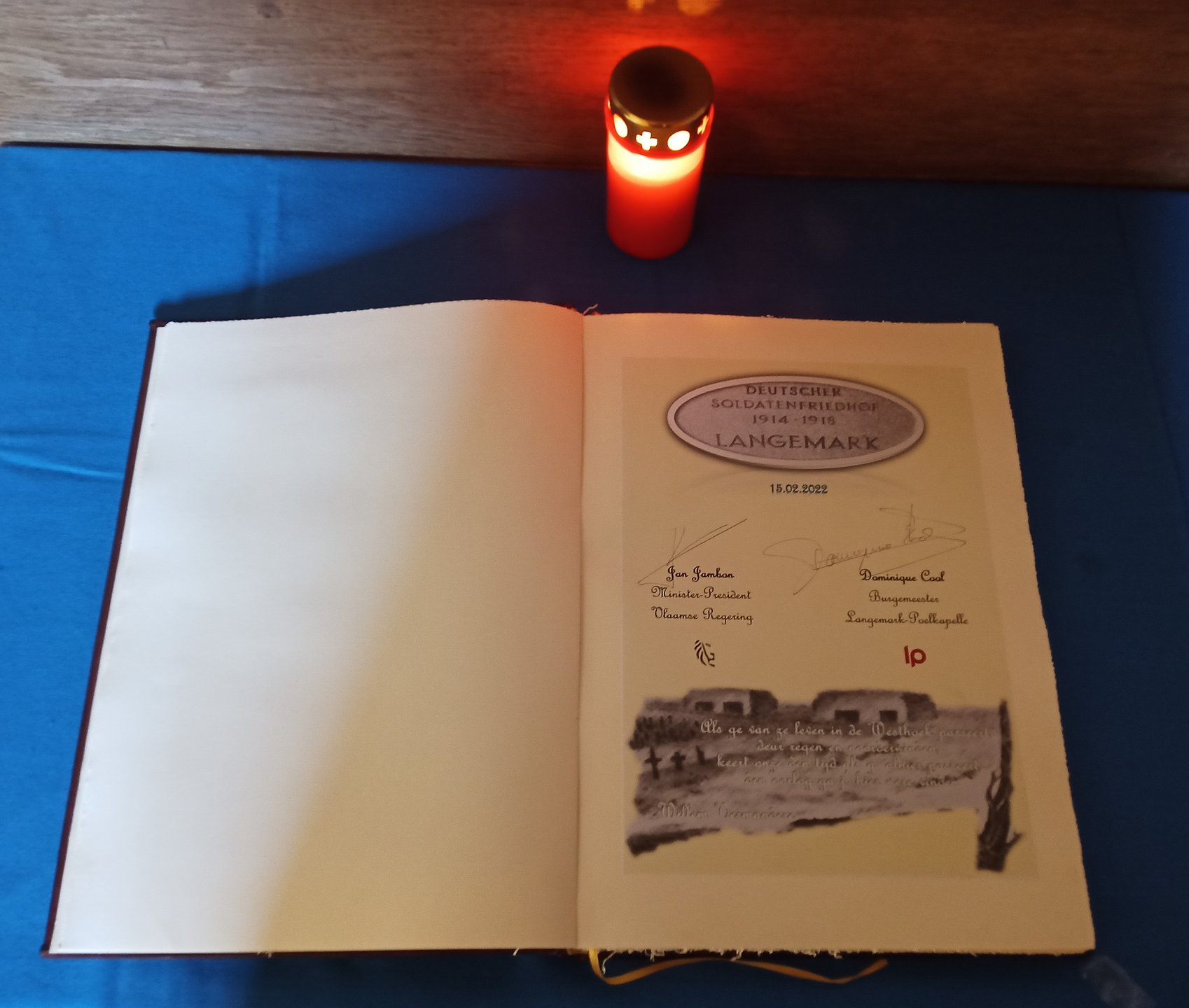 Am 15. Februar 2022 besuchte der Ministerpräsident der flämischen Regierung Jan Jambon den deutschen Soldatenfriedhof in Langemark. Bei Begrüßung durch den Bürgermeister und den Länderbeauftragten trug er sich im Listenraum im Gästebuch ein und pinnte sofort die angebotene "Vergissmeinnicht"-Nadel auf.
